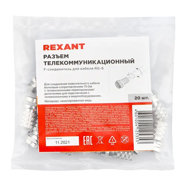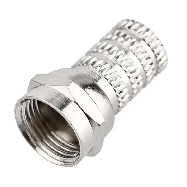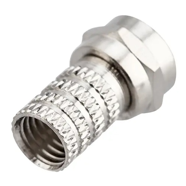 F-разъем RG-6 (03-008C) REXANT предназначен для соединения коаксиального кабеля с волновым сопротивлением 75 Ом с телевизионным и видеооборудованием (ресиверы, телевизоры, всевозможная видеоаппаратура и т.д.). Разъем данного вида не имеет непосредственного штекера, поэтому роль штекера выполняет центральная жила кабеля, что позволяет избежать дополнительных потерь сигнала. F-коннектор изготовлен из никелированного сплава меди (биметалл). Разъем устанавливается на кабель методом накрутки гильзы разъема на внешнюю оболочку кабеля, после соответствующей зачистки контактов, и не требует применения каких-либо специальных инструментов. F-штекер выступает в роли своеобразного экрана за счет накручивания на оплетку кабеля для выполнения роли электрического контакта. Такой высокочастотный соединитель имеет ряд положительных преимуществ: