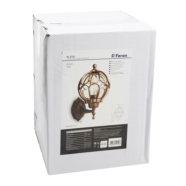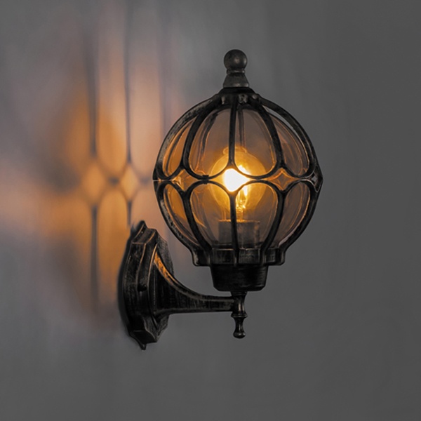 Светильник уличный настенный - бра для загородного дома 11349 Светильник садово-парковый Сфера PL3701 E27 180*200*320мм черное золото (на стену вверх) предназначен для освещения открытых или полузакрытых пространственных объемов, внутренних помещений с повышенным уровнем влажности, может быть использован для организации подсветки фасадов. Конструкция светильника: фонарь, консоль, монтажная платформа. Консольное примыкание – в нижней части фонаря. Материал арматуры и несущих элементов – сплав алюминия и кремния (силумин). Плафон шарообразной формы изготовлен из кварцевого стекла. Дополнительная информация Производитель – компания Feron (Китай). Габариты – 180х200х320 мм. Устойчивость материала к атмосферным и механическим воздействиям – высокая. Электро-комплектация – резьбовой патрон под цоколь Е27. Номинальные токовые характеристики: мощность нагрузки в пределах – 60 Ватт; источник энергии – общая сеть переменного тока с напряжением 220 Вольт. Источник света – лампа с нитью накаливания или светодиодная. Коэффициент защиты от пыли и влаги – IP44. Форма фонаря и плафона – шар. Цвет – черное золото.