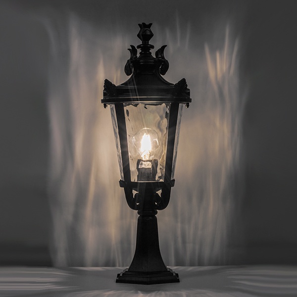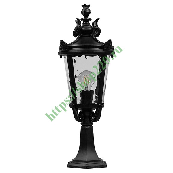 Светильник садово-парковый Прага PL4004 E27 230*230*570мм черный на постамент позиционируется как осветительное оборудование для площадок и объектов, незащищенных от атмосферных воздействий. Литая арматура фонаря оснащена стеклянными вставками. Фонарь располагается на четырехгранной платформе, которая служит элементом накладного монтажа. Установка производится на любые архитектурные элементы (садовые тумбы, ограждения виде парапетов и балюстрад), имеющие ровную и твердую венчающую плоскость. Материал литья – сплав алюминия и силумина. Стилевое исполнение – ранний Ампир.