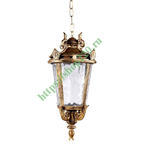 Корпус фонаря имеет круглую форму, литой каркас имитирует художественную ковку. Цвет светильника – «Черное золото». Диаметр окружности фонаря составляет 230 мм, высота 460 мм, а длина металлической цепочки 500 мм. В фонаре в качестве источника света необходимо использовать лампочки накаливания, а также энергосберегающие и диодные лампы с цоколем Е27.