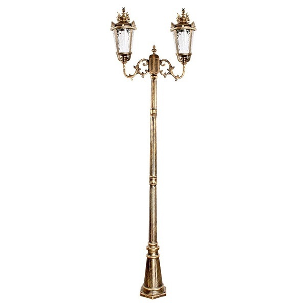 Светильник садово-парковый Прага PL4008 2*E27 680*230*2350мм черное золото (столб 2,32м) состоит из двух фонарей, имеющих общий базовый элемент, и опорного столба. Наличие комплекса из двух источников света дает преимущество в интенсивности освещенности пространства, расположенного по фронту светильника, в зоне наложения световых лучей и максимально увеличивает его объем. Установка светильника актуальна в местах пересечения аллей и на открытых площадках, обозначенных как зона отдыха.