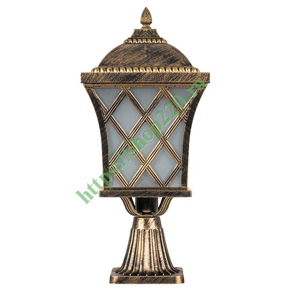 Описание: Конусная опора, расположенная на четырехгранной монтажной платформе, удерживает фонарь с сетчатой арматурой, защищающей плафон, и куполом – полусферой. Цвет – черное золото.