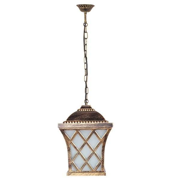 Светильник садово-парковый Тартан PL4064 E27 235*235*345мм черное золото (на цепочке 500мм) предназначен для организации общего освещения в помещениях с повышенной влажностью или открытых для негативных атмосферных воздействий. Светильник монтируется на потолок, своды арок и консольные выступы зданий.