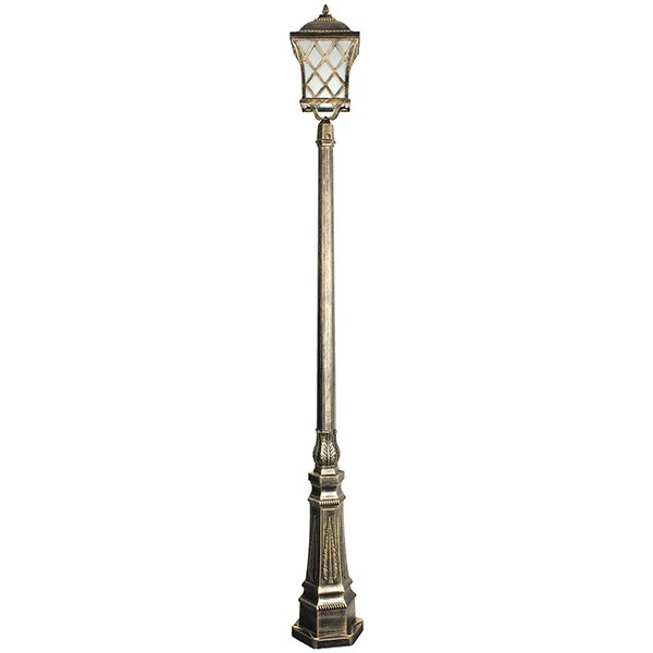 Изготавливается из стойкого к неблагоприятным погодным условиям силумина и имеет степень защиты, относящуюся к классу IP44. Светильник устанавливается на столбе и имеет общую высоту 2,29 м. Фонарь четырехгранной квадратной формы 235х235 мм. Дизайн выполнен в готическом стиле из силумина. Светильник окрашен в темный цвет под черное золото.