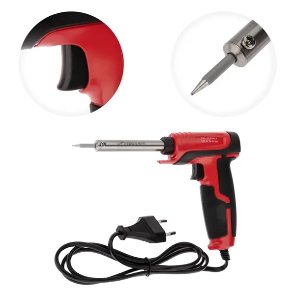 Паяльник импульсный с керамическим нагревателем (Профи) 30-70 Вт ZD-722B REXANT предназначен для ручного монтажа радиоэлементов. Он используется для пайки электродеталей в двух мощностных режимах: 30 Вт и 70 Вт. Особенность данного инструмента заключается в том, что максимальная мощность и ускоренный разогрев активируются нажатием и удержанием курка. Это позволяет оператору сначала установить жало инструмента в определенную точку пайки, а затем нажатием кнопки на корпусе перевести паяльник в максимальный рабочий режим. Паяльник выполнен с керамическим нагревательным элементом и индикатором включения в форме пистолета и имеет очень удобную эргономичную рукоятку из пластика с резиновыми вставками. Характеризуется экономичным энергопотреблением. Удобен для распайки кабелей в шкафах, а также быстрых демонтажных работ.