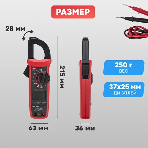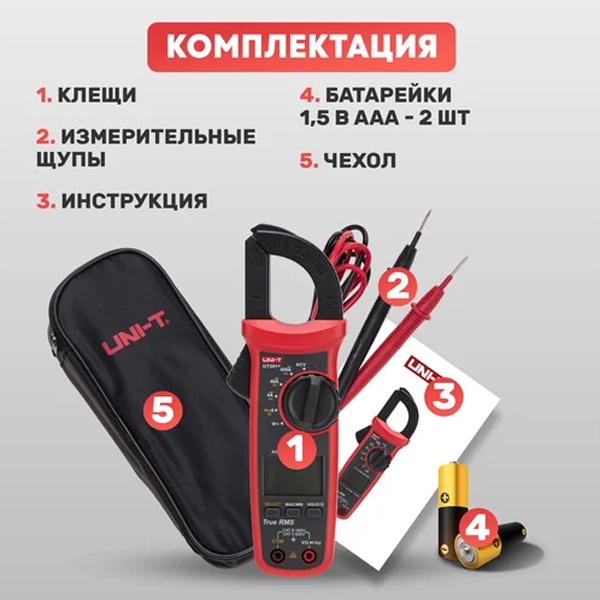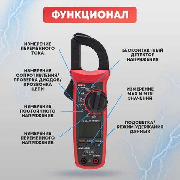 Цифровые токовые клещи UNI-T UT201+ TRUE RMS — усовершенствованная версия популярной модели UT201, предназначенная для точных и надёжных измерений переменного тока, постоянного и переменного напряжения (до 600 В), а также сопротивления.