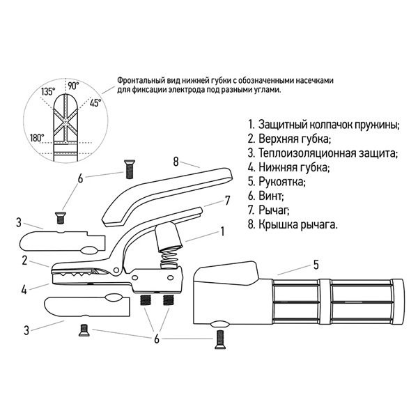 Держатель рассчитан на длительную эксплуатацию и отличается высокой надежностью. Он обеспечивает плотную фиксацию электродов различных диаметров, а также сварочного кабеля, что способствует стабильности сварочного процесса. Специальный рельеф зажимной пластины позволяет закреплять электрод в четырёх различных положениях, обеспечивая удобство при сварке под разными углами.
