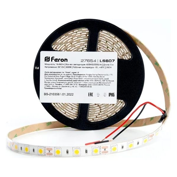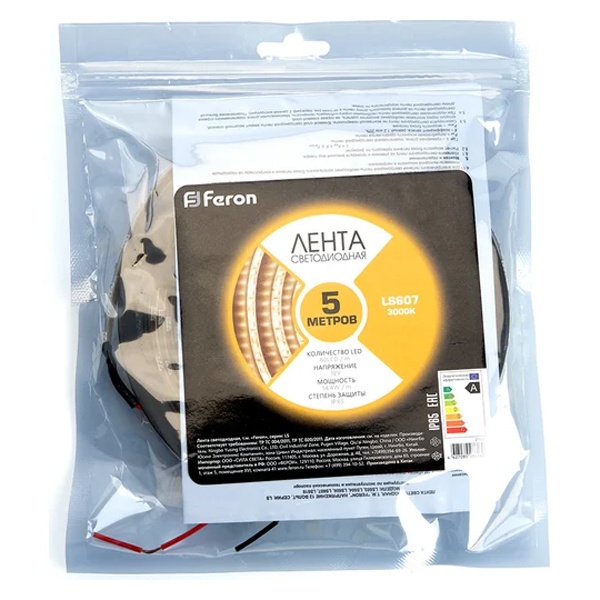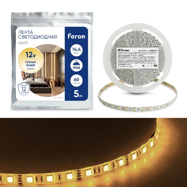 Лента светодиодная 12V FERON LS607, 60*SMD5050, 14,4W/m, IP65, 3000К (теплый белый), Кратность резки мм 50мм, 5000 *10 *3мм