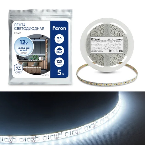 Герметичная светодиодная лента белая 5m LS613 120SMD(3528)/m белая 12V, мощностью 9.6W/m IP65 Ферон 27731