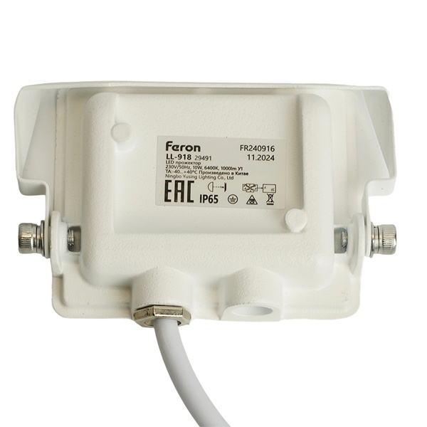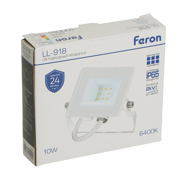 Прожектор светодиодный многоматричный с монтажным креплением на кронштейн, (ДО) FERON LL-918, 10W, 6400К (холодный белый), 230V/50Гц, 1000Lm, IP65, угол рассеивания 120,*SMD2835, раб.t -40C - +40C, цвет белый, корпус алюминий литой под давлением + стекло, 81*21*76 мм