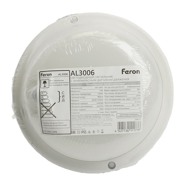 Пылевлагозащищенный светодиодный светильник Ферон AL3006 со встроенным инфракрасным датчиком движения, мощность 12 Ватт, холодный дневной свет 29611 Пылевлагозащищённый светодиодный светильник AL3006 ТМ Feron артикул 29611 имеет встроенный инфракрасный датчик движения и предназначен для использования в помещениях с нерегулярной потребностью в освещении. Идеально подходит для сферы ЖКХ и коммунальных хозяйств.