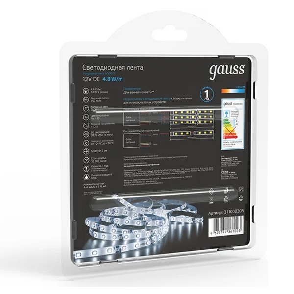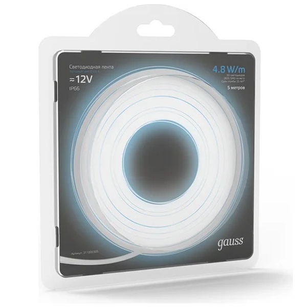 311000305 Лента светодиодная Gauss 2835/60-SMD 4.8W/m 12V DC холодный белый IP66 (упаковка 5м)