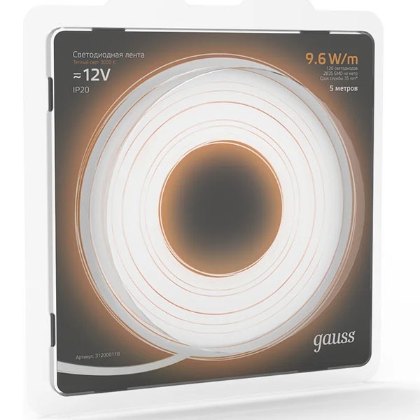312000110 Лента светодиодная Gauss 2835/120-SMD 9.6W/m 12V DC теплый белый IP20 (упаковка 5м)
