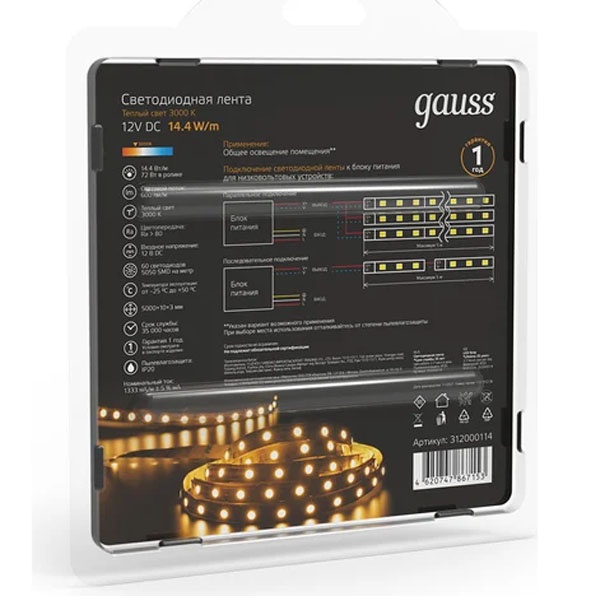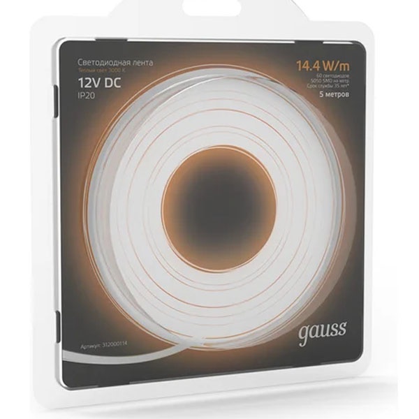 Лента светодиодная Gauss 5050/60-SMD 14.4W/m 12V DC теплый белый IP20 (упаковка 5м) 312000114