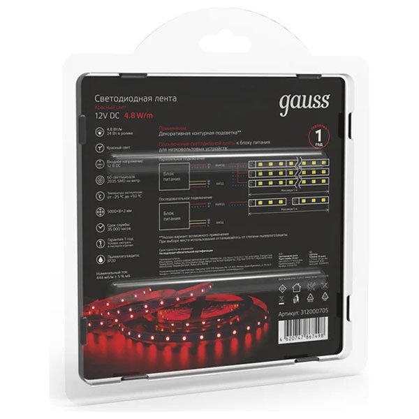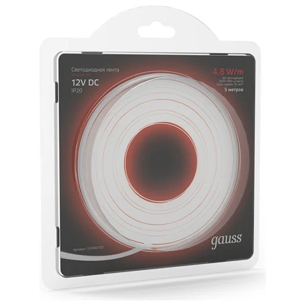 12ти вольтовая красная LED лента Гаусс мощностью 4.8 Вт/м , длиной 5000мм, IP20. 312000705