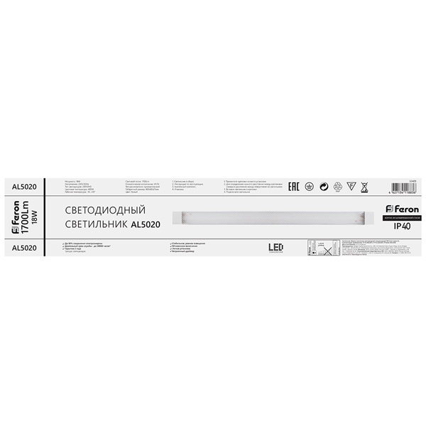 Белый линейный LED светильник накладного исполнения Ферон AL5020, мощностью 18 Ватт белого света. 32409 Светодиодный накладной светильник Feron AL5020 – это бюджетная модель для внутреннего освещения жилых и общественных помещений: офисов, торговых залов, подсобных помещений, коридоров, лестничных пролетов и пр.
