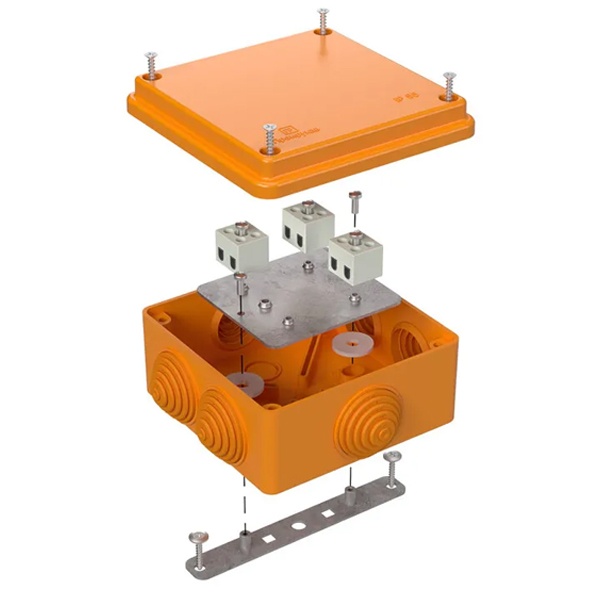 Коробка распределительная огнезащитная входит в состав огнестойких кабельных линий компании Промрукав и представляет собой пластиковый бокс оранжевого цвета, который оснащен крышкой и 6 вводами для кабелей. Он используется при прокладке систем противопожарной безопасности по стенам и потолкам зданий. Конструкция из двух стальных пластин позволяет надежно крепить его к поверхности. Основное назначение коробки состоит в механической защите мест соединения проводов и кабелей, а также для предотвращения попадания пыли, влаги и посторонних предметов внутрь. Она имеет открытый тип установки, поэтому обладает надежной степенью защиты IP55. Мембранные сальники на вводах с диаметром 25 мм служат для герметичности подвода проводов. Коробка имеет 6 полюсов на 3 керамических колодках для проводов сечением 2.5 мм2. Ее установка допустима в сетях с рабочим напряжением до 750 Вольт. Материалом коробки является безгалогенный полимер, который имеет высокую стойкость к воспламенению от нагретой проволоки. Предел огнестойкости составляет Е15-Е120, что означает время работы линии в условиях пожара, необходимого для эвакуации людей в безопасную зону. Размеры коробки: 100х100х50 мм. Температура эксплуатации: -25 до 40 градусов Цельсия.