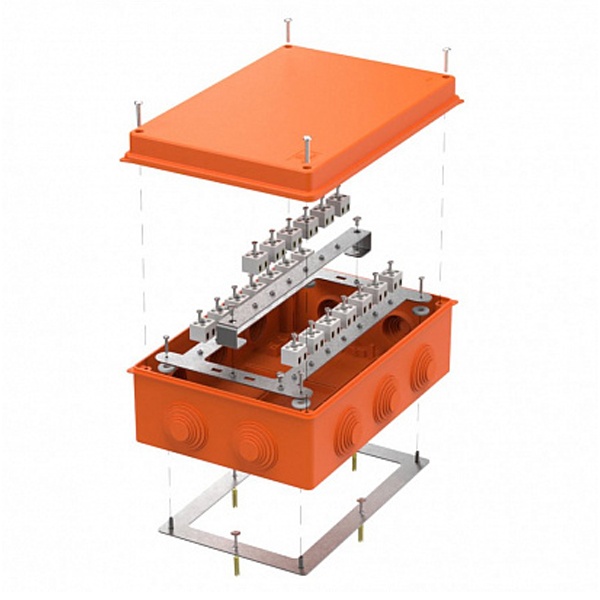 Монтажная коробка серии 40-0330-FR от известной компании Промрукав представляет собой оранжевый огнеупорный бокс с крышкой на 10 вводов, который применяется при прокладке систем противопожарной безопасности по стенам, потолкам зданий и сооружений. Он обладает открытым типом установки, поэтому имеет степень защиты IP55 и оснащен мембранными сальниками для герметичности ввода проводов. Диаметр кабельных отверстий составляет 32 мм. Основное назначение коробки состоит в механической защите мест соединения проводов и кабелей, а также для защиты внутреннего пространства от попадания пыли, влаги и посторонних предметов. Конструкция из двух стальных элементов позволяет надежно крепить ее к поверхности стен и потолка. Материалом изготовления корпуса и крышки служит термостойкий полимер без галогенов, имеющий высокую устойчивость к воспламенению от нагретой проволоки до 650 градусов Цельсия. Предел огнестойкости находится в диапазоне E15-E120. Максимальное сечение подключаемых проводов составляет 2.5 мм2. Коробка имеет 40 полюсов на 20 керамических колодках и обладает следующими размерами: 260х175х90 мм. Она рассчитана на установку в сетях с применением огнестойких кабелей серии FR с рабочим напряжением до 750 Вольт и выдерживает температуру эксплуатации от -25 до 40 градусов Цельсия. В комплект поставки входит крепеж и инструкция по монтажу.