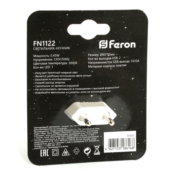 Светодиодный светильник ночник FN1122 Ферон, с датчиком освещенности, оснащен двумя USB портами 5В 2А 41021 Светодиодный светильник ночник FN1122 Ферон предназначен для декоративной и навигационной подсветки в спальнях и детских комнатах в темное время суток.