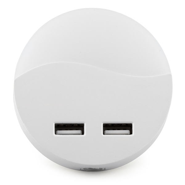 Преимущества: Включается автоматически при освещенности менее 15 Лк. Оснащен двумя портами USB с общим током нагрузки не более 2А, что позволяет заряжать аккумуляторы ваших гаджетов с помощью одного лишь data кабеля. Прямое подключение в бытовую розетку 230В/50Гц. Соответствует требованиям безопасности ГОСТ Р МЭК 60598-1-2011. Характеристики: Мощность: 0,45 Вт Источник света: 1 LED Цветовая температура: 3000 К Количество выводов USB: 2 Характеристики выводов: 5В 2А Материал корпуса: пластик Цвет корпуса: белый Описание от производителя: