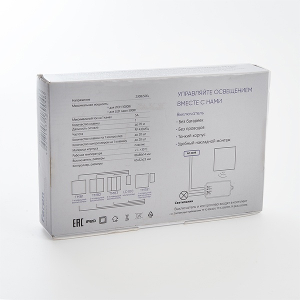 Комплект Ферон TM181 из кнопки-выключателя TM81 и контроллера LD100 , 500 Ватт 41126 Устройство управления освещением и другими электроприборами отличается простым и быстрым монтажом, а также возможностью применения в бесчисленном множестве областей. Базовый комплект состоит из контроллера освещения и накладной кнопки управления. Контроллер нужно просто подключить к сети 230V и устройству, которым вы хотите управлять, например, к люстре. Кнопку можно просто наклеить на стену и управлять включением/выключением света из любого удобного места.