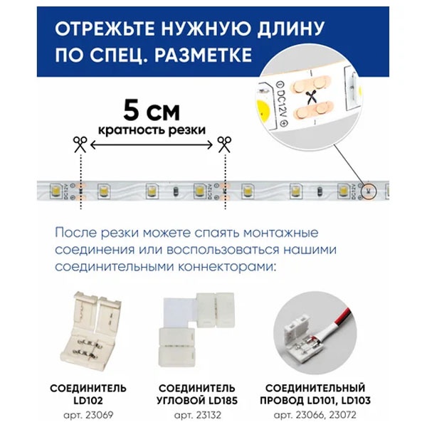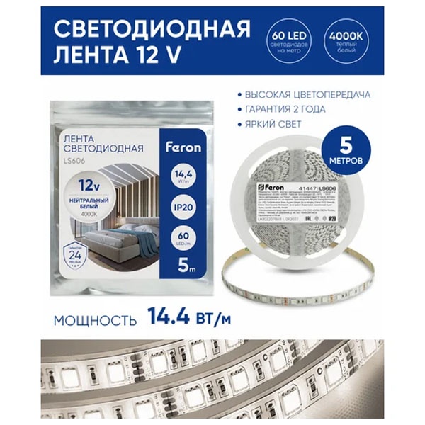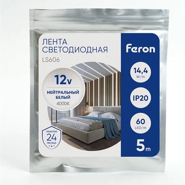 Лента светодиодная 12V FERON LS606, 60*SMD5050, 14,4W/m, IP20, 4000К (нейтральный белый), Кратность резки мм 50мм, 5000 *10 *2.32мм