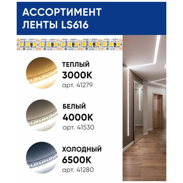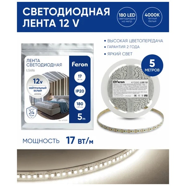 Светодиодная лента Ферон модели LS616 мощностью 17 Вт/м длиной 5 метров нейтрального белого света, напряжением 12 Вольта 41530