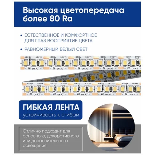 Светодиодная лента TM «Feron» предназначена для декоративной подсветки внутри помещений, создания статических и светодинамических эффектов.