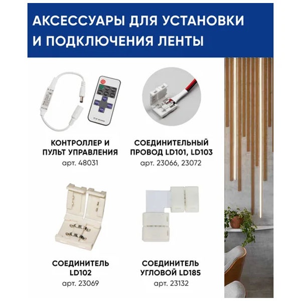 Подключение светодиодной ленты осуществляется через блок питания постоянного тока на напряжение 12В (не входит в комплект поставки).