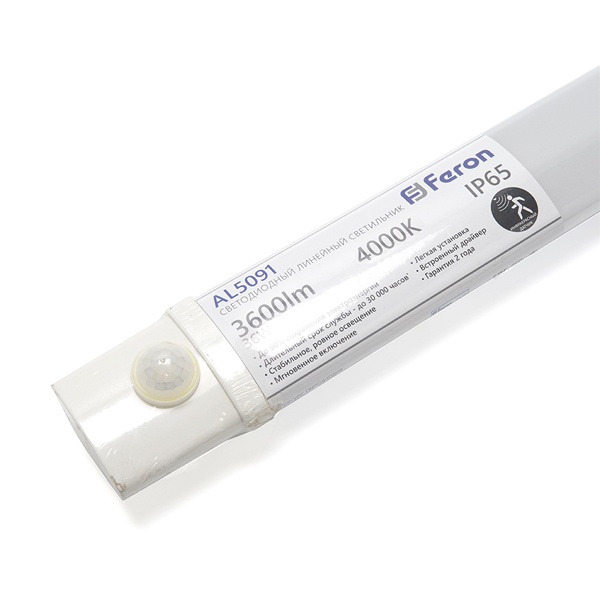 Светильник пылевлагозащищенный светодиодный, с ИК-датчиком (ДПП) FERON AL5091, 36W, 4000К (белый), 180-265V, 3600Lm, IP65, цвет белый, корпус пластик, рассеиватель пластик, 1170*63*35 мм