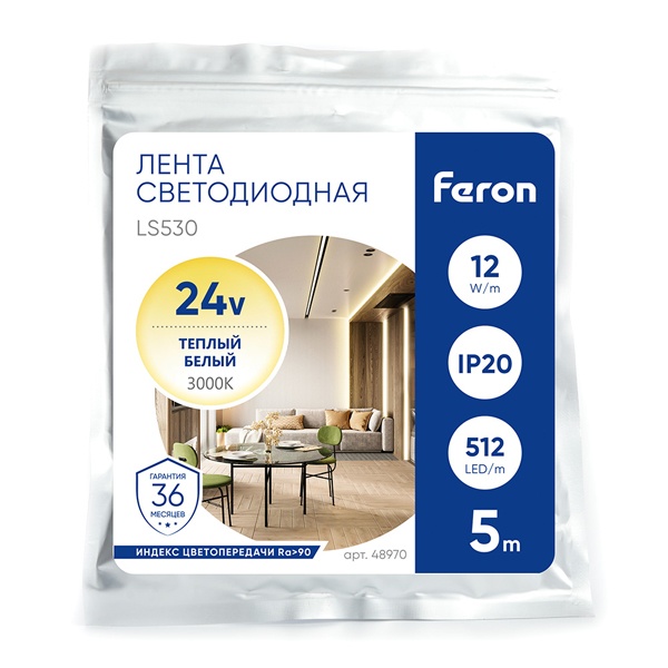 Светодиодная лента Ферон модели LS530 мощностью 12 Вт/м длиной 5 метров теплого белого света, напряжением 24 Вольта 48970