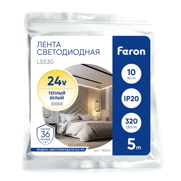 Светодиодная лента мощностью 12 Вт/м длиной 5 метров теплого белого света, напряжением 24 Вольта 5036123