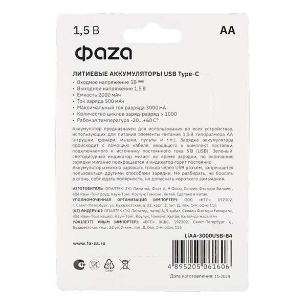 5061606 Аккумулятор литиевый Фаzа AA 1.5В Li-Ion 3000мА.ч зарядка от Type-C, шнур в комплекте (упаковка 4шт)