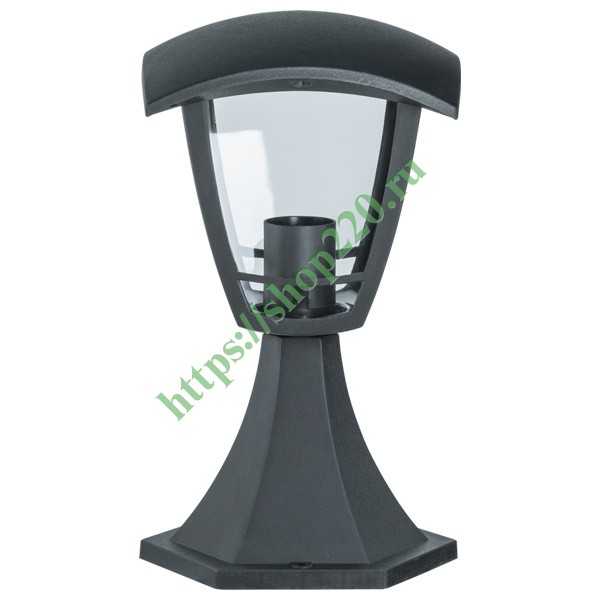 Светильник в виде четырехгранника из серии NOF-P, модель P03, от компании Navigator представляет собой черный фонарь для декоративного освещения садово-парковой зоны, террас и подъездных дорожек. Он имеет наземный тип установки и состоит из влагозащищенного корпуса со степенью защиты IP44 и стойки, на которую крепится светильник. Материалом изготовления конструктивных элементов выступает прочный пластик с матовым покрытием. Плафон из прозрачного поликарбоната обеспечивает равномерное распределение света. На основании корпуса расположен патрон с цоколем Е27 для установки лампы, направленной вертикально вверх. Подходящие типы источника света: обычные лампы накаливания, компактные люминесцентные и светодиодные. Максимальная мощность для лампы накаливания составляет 60 Ватт. Подключение светильника осуществляется проводниками с сечением 0.5-1.0 квмм и допускает его работу от сети с напряжением 230 Вольт.