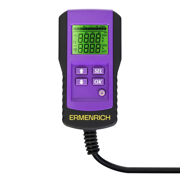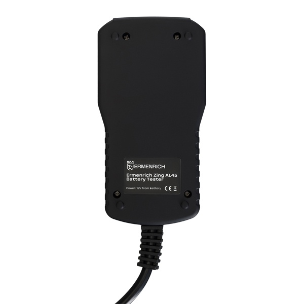Ermenrich Zing AL45 — тестер для проверки автомобильных аккумуляторов и источников бесперебойного питания (ИБП). Он измеряет напряжение, ток холодного пуска (CCA) и внутреннее сопротивление батареи, выводя результаты на ЖК-дисплей. Прибор питается напрямую от проверяемого источника.