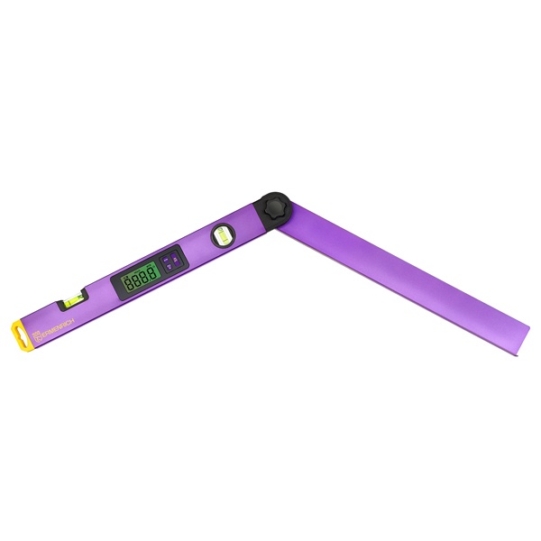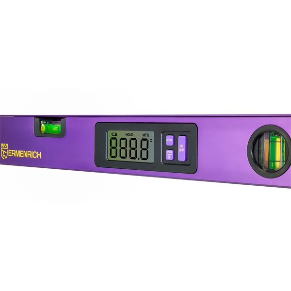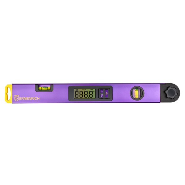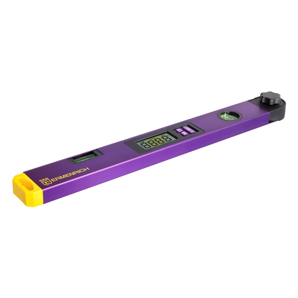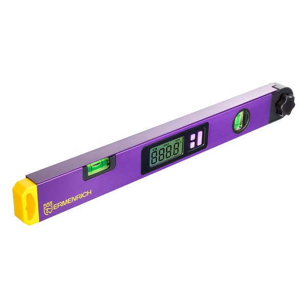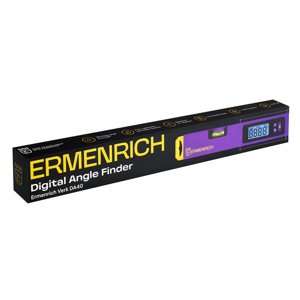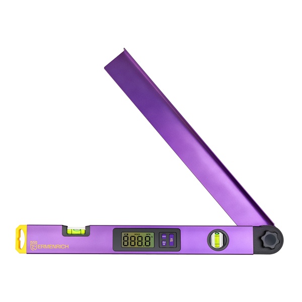 Ermenrich Verk DA40 способен не только определять углы как таковые, но и преобразовывать результаты замеров в угол распила. Функционал инструмента будет особенно полезен при работе с облицовочными и пиломатериалами. Для точности измерений в алюминиевый корпус угломера длиной 450 мм вмонтированы 2 горизонтальных пузырьковых уровня.