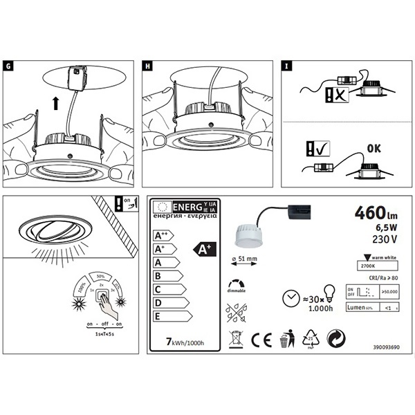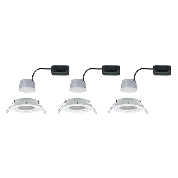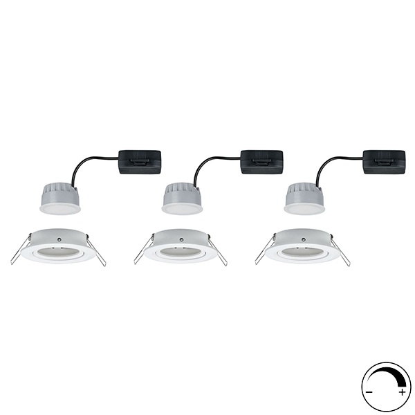 3-х ступенчатая регулировка яркости. Так как источник света вставляется сзади, стопорное кольцо не требуется. Благодаря прямому подключению на 230В, вы можете легко соединять источники света без ограничений. Благодаря несложной фиксации с помощью удерживающих пружин потолок остается неповрежденным даже после многократной установки и снятия. В комплект поставки входят три светильника, эффективные и долговечные светодиодные модули. Очень плоский - установка также возможна с малой глубиной от 30 до 35 мм.