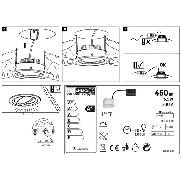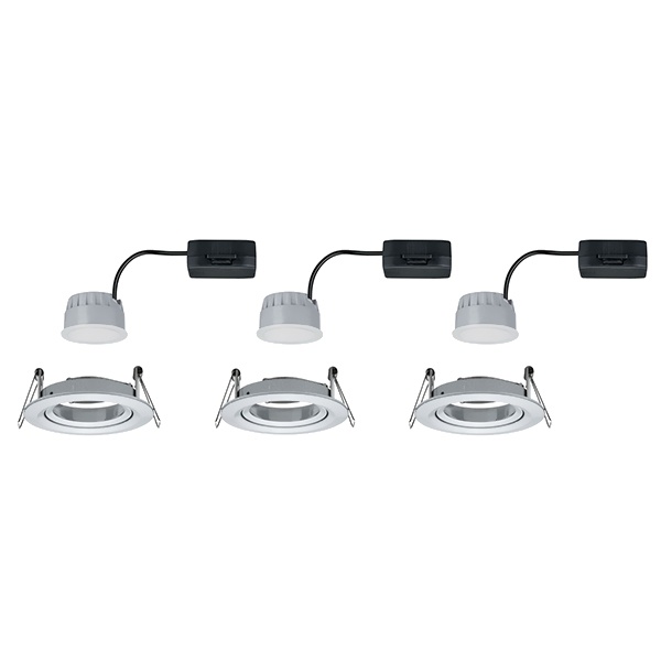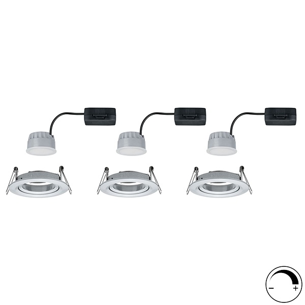 3-х ступенчатая регулировка яркости. Так как источник света вставляется сзади, стопорное кольцо не требуется. Благодаря прямому подключению на 230В, вы можете легко соединять источники света без ограничений. Благодаря несложной фиксации с помощью удерживающих пружин потолок остается неповрежденным даже после многократной установки и снятия. В комплект поставки входят три светильника, эффективные и долговечные светодиодные модули. Очень плоский - установка также возможна с малой глубиной от 30 до 35 мм.