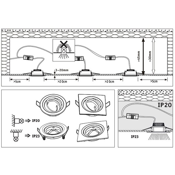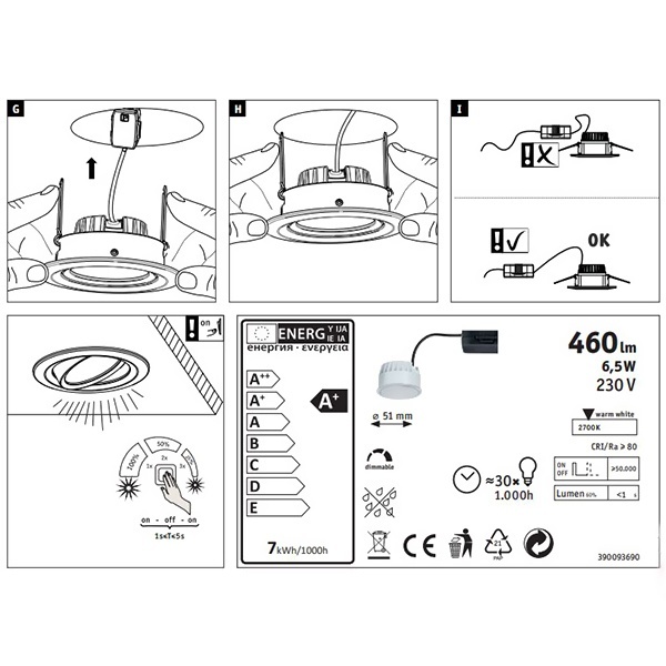 3-х ступенчатая регулировка яркости. Так как источник света вставляется сзади, стопорное кольцо не требуется. Благодаря прямому подключению на 230В, вы можете легко соединять источники света без ограничений. Благодаря несложной фиксации с помощью удерживающих пружин потолок остается неповрежденным даже после многократной установки и снятия. В комплект поставки входит светильник, эффективный и долговечный светодиодные модуль. Очень плоский - установка также возможна с малой глубиной от 30 до 35 мм.