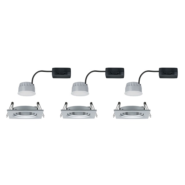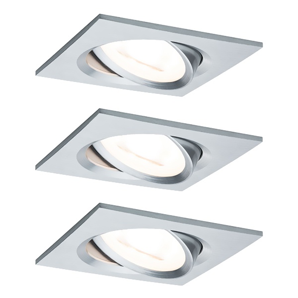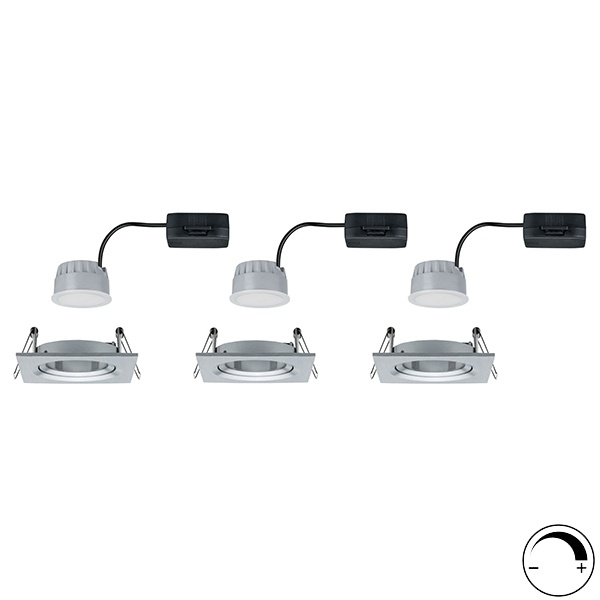 Набор из трех потолочных, квадратных, точечных, поворотных, диммируемых светильников акцентного освещения, встраиваемого монтажа, со светодиодным модулем мощностью 6,5 Ватт, теплый свет, цвет матовый алюминий 93492