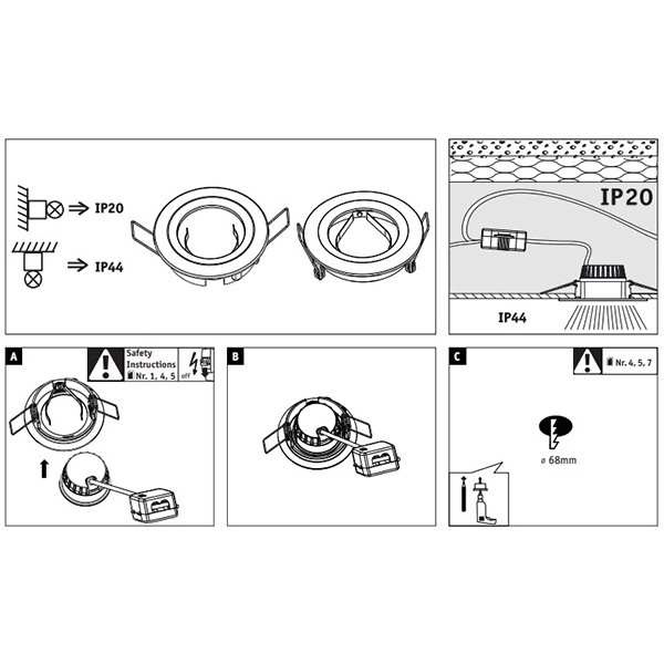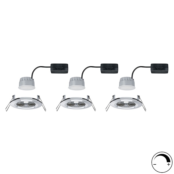 3-х ступенчатая регулировка яркости. Так как источник света вставляется сзади, стопорное кольцо не требуется. Благодаря прямому подключению на 230В, вы можете легко соединять источники света без ограничений. Благодаря несложной фиксации с помощью удерживающих пружин потолок остается неповрежденным даже после многократной установки и снятия. В комплект поставки входят три светильника, эффективные и долговечные светодиодные модули. Очень плоский - установка также возможна с малой глубиной от 30 до 35 мм.