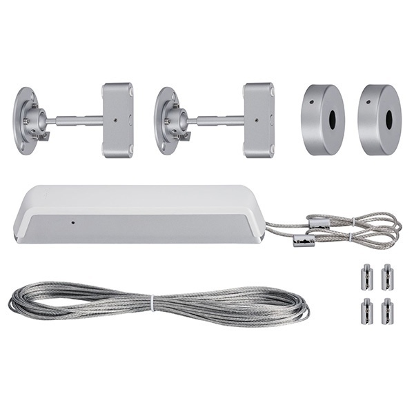Струнная система освещения торговой компании Paulmann представляет собой базовый комплект с трансформатором. Он относится к серии 2Line Basic Set и внешне состоит из натянутого троса, размещенного в 2 линии, на которых точечно размещаются светодиоды с максимальной мощностью 36 Ватт. Источники освещения приобретаются отдельно по своим предпочтениям: будь то направленный свет, равномерное распределение или свисающие маятники для подсветки рабочих зон. Конструкция крепится к потолку и освещает до 6 кв м площади помещения. В базовую комплектацию входит струна длиной 12 м, блок питания и крепежные детали. Тросовая система освещения – это низковольтная система на 12-24 Вольта, которая используется только совместно с индукционным трансформатором для работы в сети с напряжением 230 Вольт. Она буквально парит в помещении и создает сверкающую игру света. Благодаря своей конструкции она приспосабливается под любую стилистику и позволяет создать свой собственный дизайн в интерьере. Внешне базовый комплект представлен в универсальных цветах. Блок питания имеет белый корпус и отлично гармонирует с классическим светлым потолком, а крепежные элементы и тросик с хромированной отделкой и матовым покрытием придадут помещению современный вид. Такое гибкое решение обладает рядом преимуществ и не вызывает проблем с прокладкой и монтажом. Оно удобно для применения даже в сложных пространственных ситуациях: наклонных потолках и соединениях через угол.
