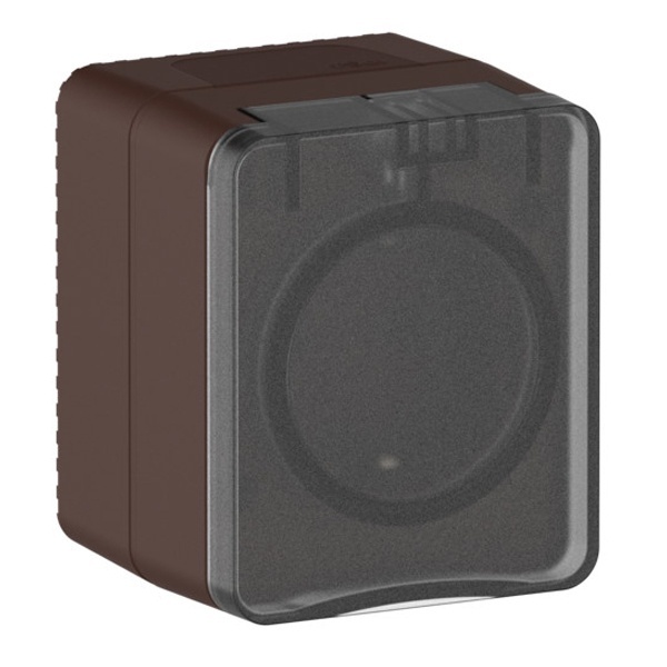 Влагозащищенная розетка с заземлением и защитными шторками накладного исполнения коричневого цвета с прозрачной крышкой, 230 Вольт 16А, AtlasDesign Profi54. ATN546045