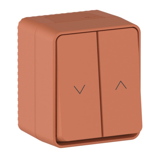 Влагозащищенный двухклавишный кнопочный выключатель накладного исполнения терракотового цвета для управления жалюзи, АтласДизайн Profi54. ATN547019