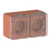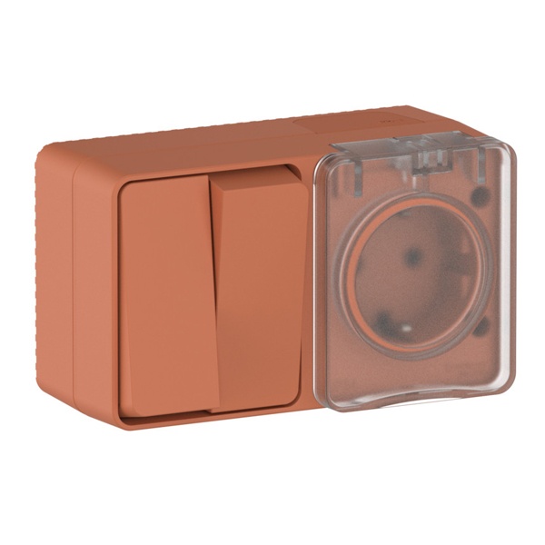 Моноблок терракотового цвета накладного исполнения из влагозащищенной розетки 16А с заземлением и защитными шторками с прозрачной крышкой и двухклавишным выключателем 10А, 230 Вольт, AtlasDesign Profi54. ATN547074