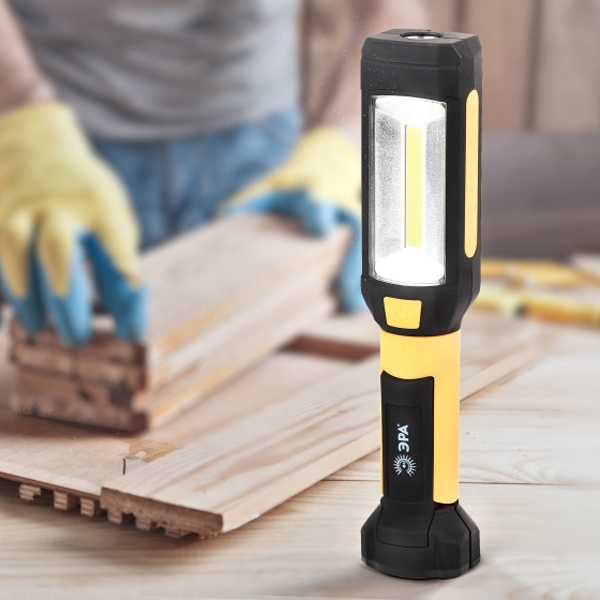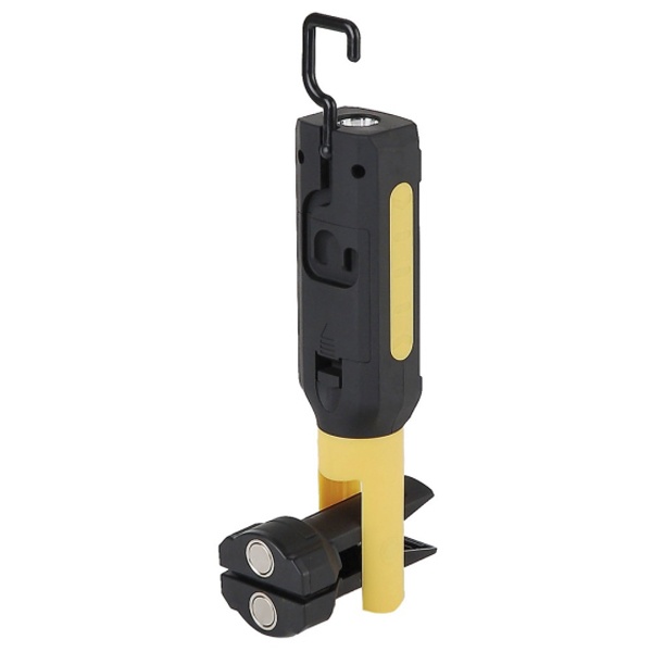 Прочная конструкция из пластика оснащена магнитом для фиксации изделия на металлических предметах, а также имеет крючок для подвешивания и прищепку. Фонарь работает от батареек типа ААА.
