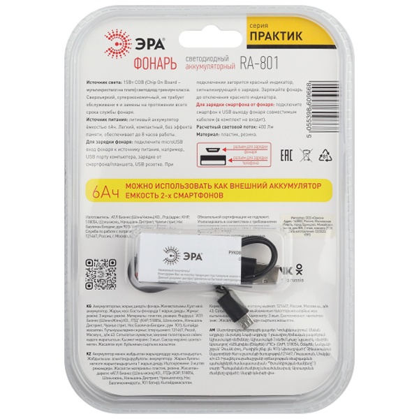 RA-801 Фонарь ЭРА Рабочий серия "Практик" [15Вт COB, powerbank 6 Ач, магнит, крючок, 3 режима, бл] (