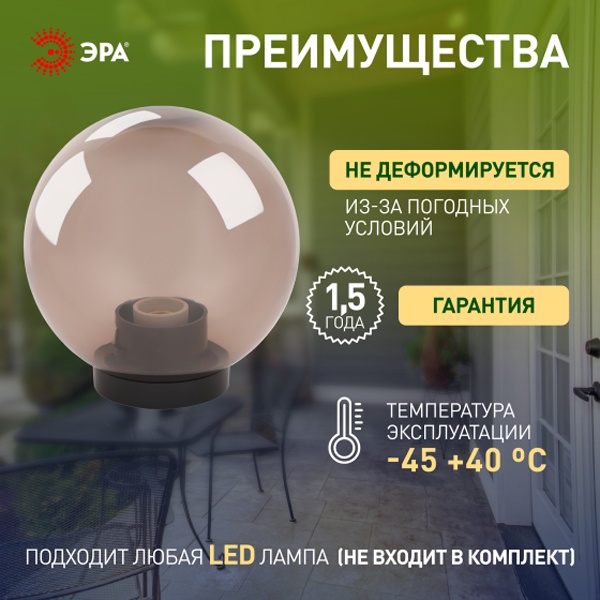 Не подвержен коррозии, деформации под воздействием погодных условий (основание выполнено из поликарбоната, рассеиватель-полиметилметакрилата). Цоколь Е27 для ламп ЛОН, КЛЛ, LED. Расчитан на мощность эквивалентную 100 Ватт лампы накаливания.