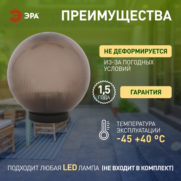 Не подвержен коррозии, деформации под воздействием погодных условий (основание выполнено из поликарбоната, рассеиватель-полиметилметакрилата). Цоколь Е27 для ламп ЛОН, КЛЛ, LED. Расчитан на мощность эквивалентную 60 Ватт лампы накаливания.