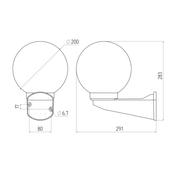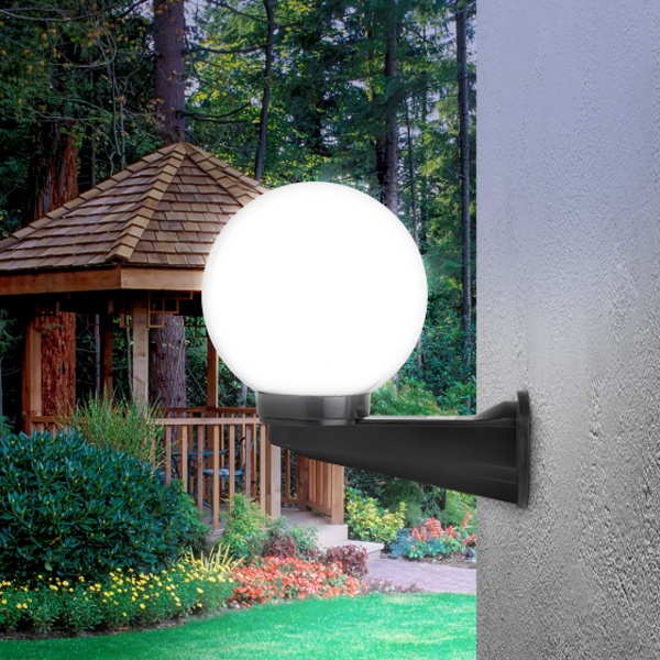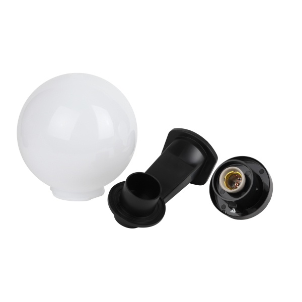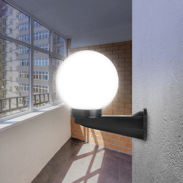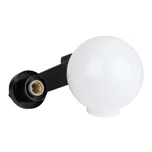 Светильник устанавливается на стену на выносном черном кронштейне. Не подвержен коррозии, деформации под воздействием погодных условий (основание выполнено из поликарбоната, рассеиватель-полиметилметакрилата). Цоколь Е27 для ламп ЛОН, КЛЛ, LED. Расчитан на мощность эквивалентную 60 Ватт лампы накаливания.